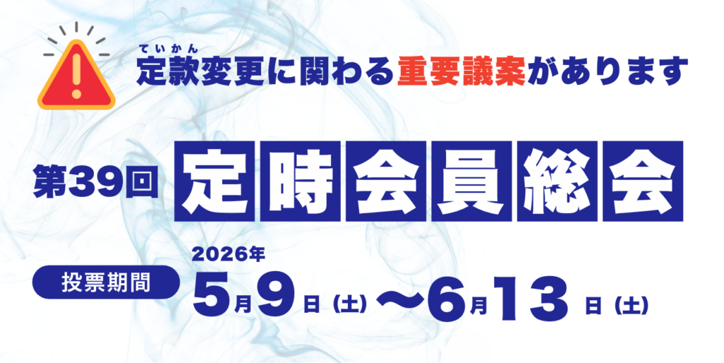 審議事項には、今年2月の臨時会員総会に続き、全会員の3分の2以上の賛意を必要とする特別決議事項が含まれます。